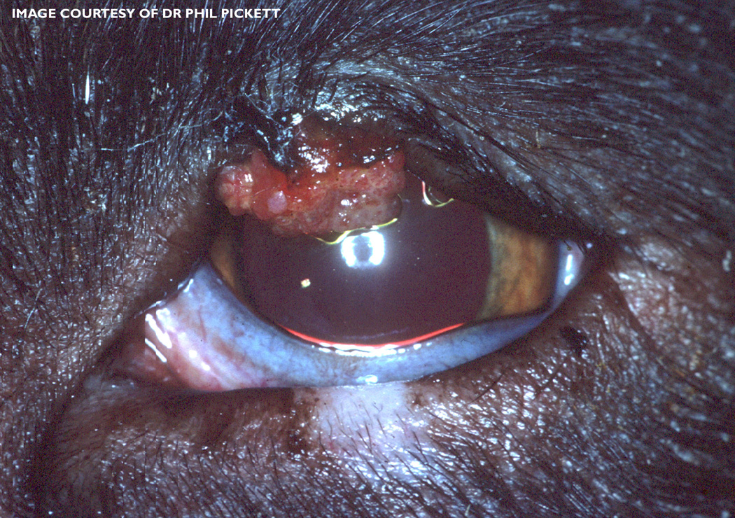 Brutus is an intact male Labrador Retriever/Something-or-Other mixed breed. At the age of 9 years he begins to develop a growth on his left eyelid. the owner at first isn't too concerned but the growth expands and gets large enough that the owner is worried. he brings Brutus in for a look. Here's what you see: