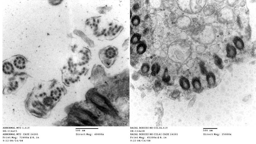 Oh, yes...the reason you have to use TEM is because while cilia are visible in the light microscope, microtubules aren't: they are well below the limit of resolution. Since this is really a case of defective microtubular synthesis, the initial clinical diagnosis has to be backed up with hard morphological evidence. Not all clients will pay for this sort of consult, but it's essential to understanding the true nature of the problem.